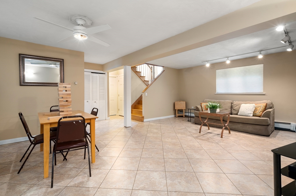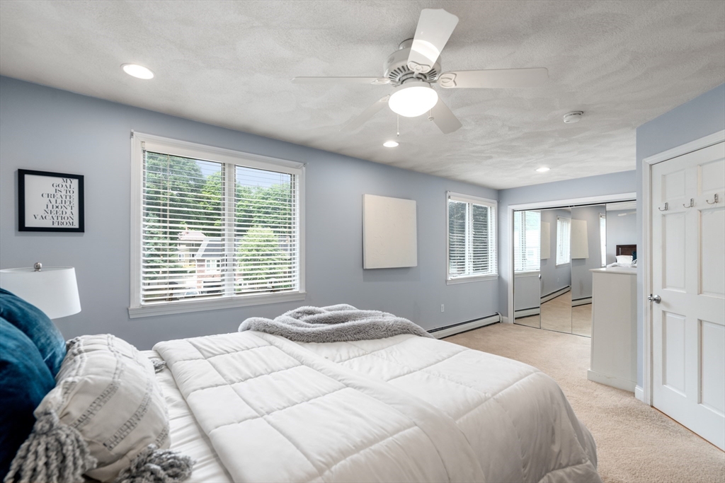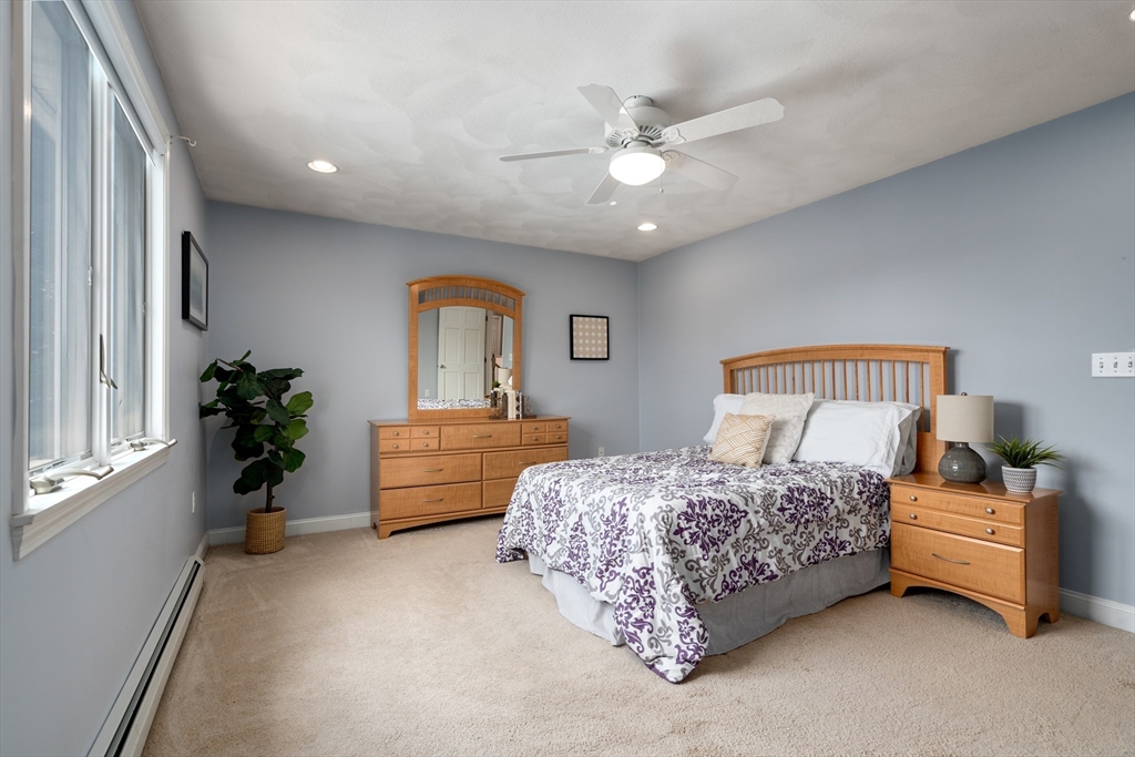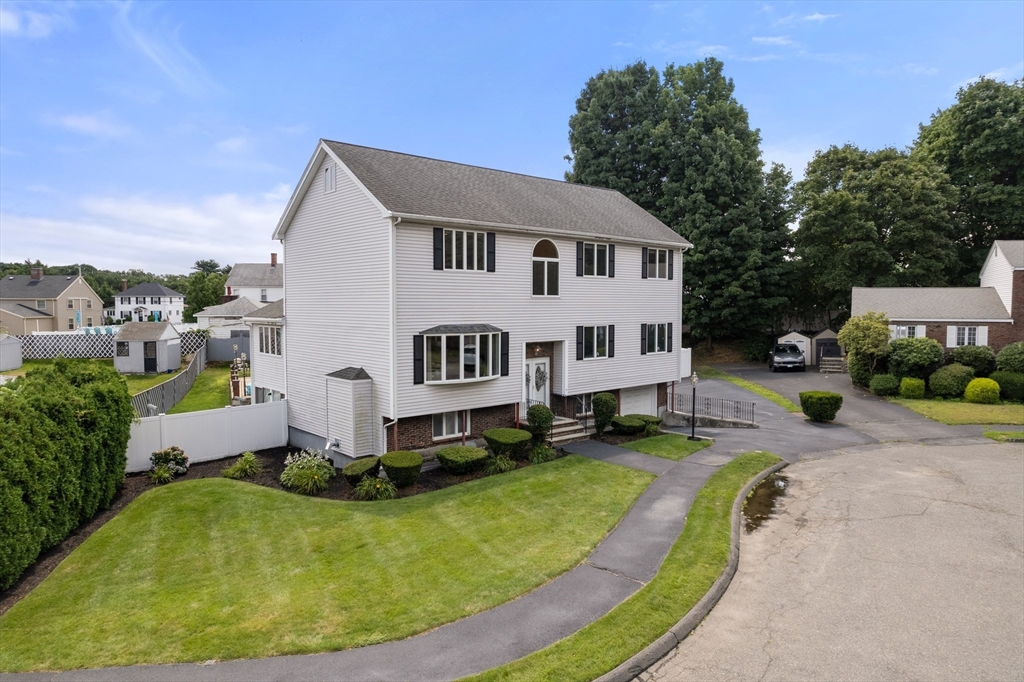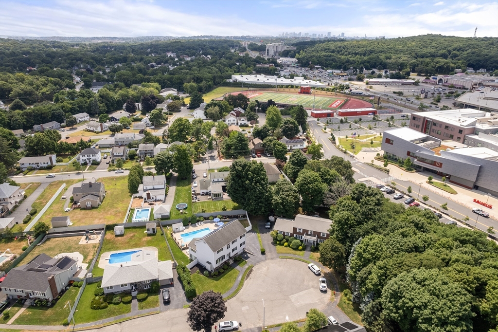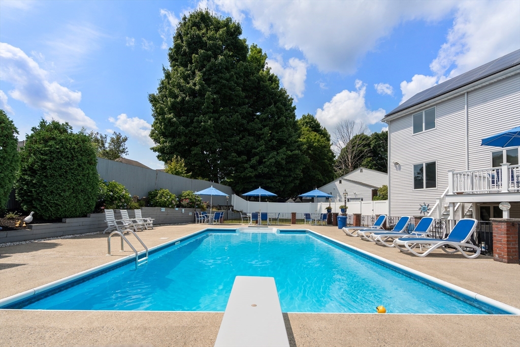 Commanding 4-bedroom Colonial-style home on over a quarter-acre in a charming cul-de-sac. The dramatic entryway opens to a living room, dining room, and kitchen, perfect for seamless living and entertaining. The kitchen boasts an expansive granite island and countertops. The main level includes an oversized primary bedroom, office, and bath with an updated shower and double vanity. The Florida room, with three glass walls and skylights, offers a year-round alfresco experience. The finished lower level features a large recreation room with a tiled hearth and pellet stove, full bath, laundry room, office, and garage access. Upstairs are three additional large bedrooms, a full bath with double vanity, and a family room. The full-height attic provides potential to finish for a fourth living level. Outdoors, enjoy a resort-like experience with an inground pool, expansive patio, and second-floor deck. Conveniently located near premier shopping, Route 1, and Logan Airport.