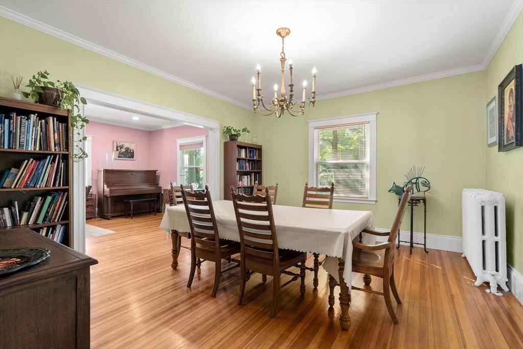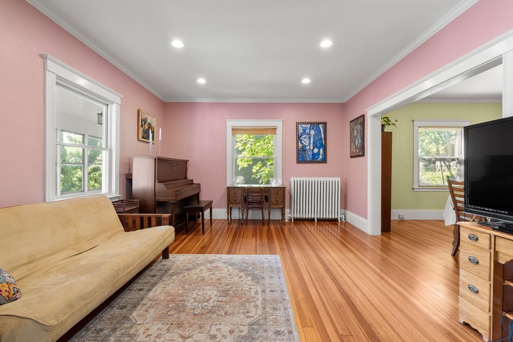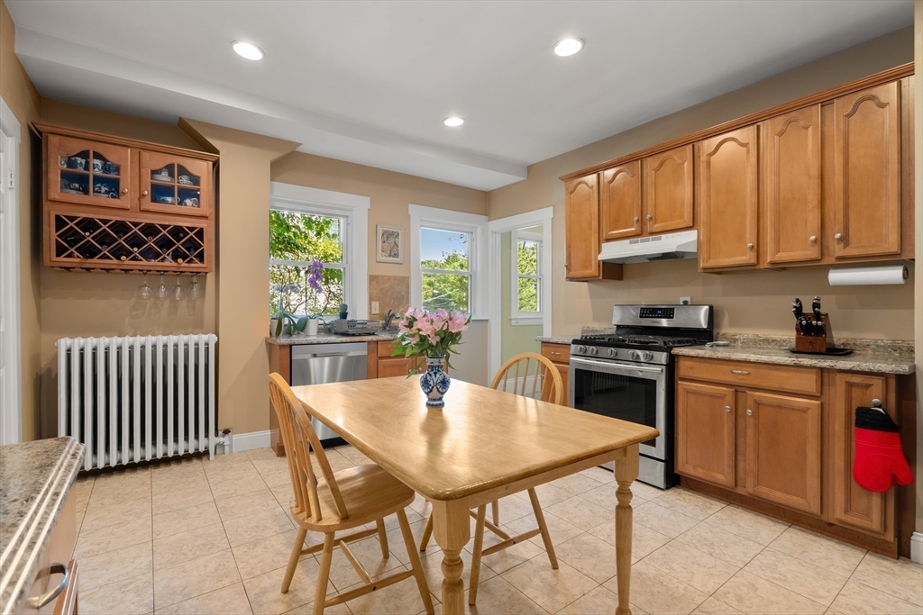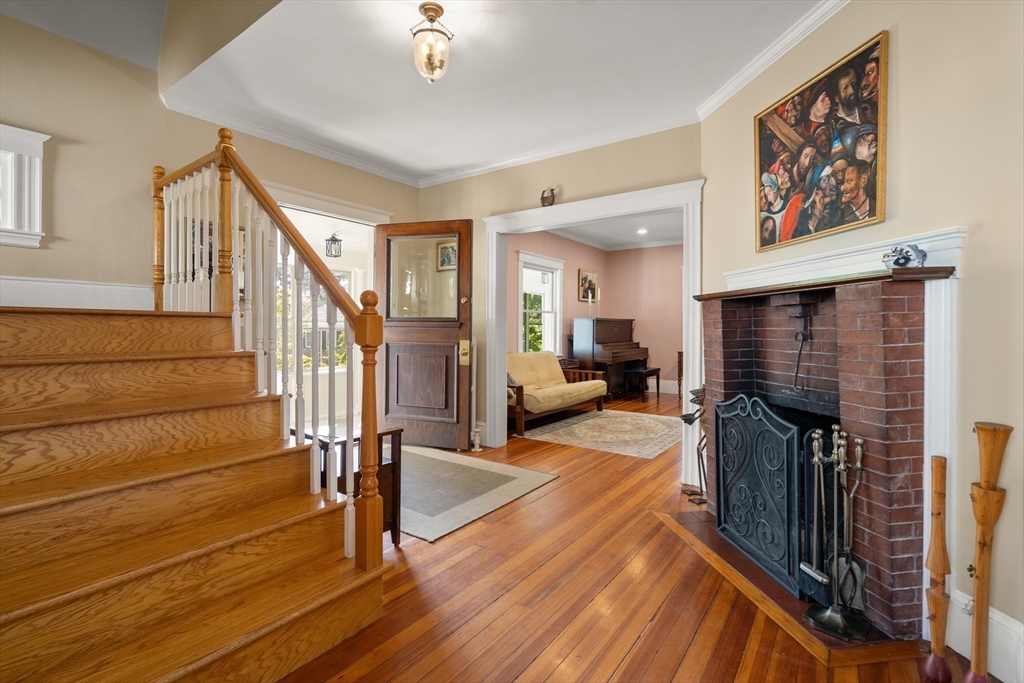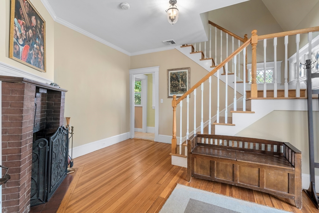 Beautifully Maintained 4 Bed / 3.5 Bath in Newton Centre. This 1950 Dutch Gambrel blends timeless charm with modern updates. A sunny front porch welcomes you into a gracious foyer featuring an original wood-burning fireplace and stained-glass windows. The living room with hardwood floors and recessed lighting flows into a spacious dining room - perfect for entertaining. The renovated kitchen offers stainless steel appliances and gas cooking, with an adjacent powder room, pantry, and laundry area. Upstairs, the large primary suite boasts two walk-in closets. A bright second bedroom has a renovated bath across the hall and the quiet 3rd bedroom has a renovated en-suite bath. The lower level includes a fourth bedroom, full bath, and ample storage. Enjoy a shaded backyard and two-car driveway. Prime location near Newton Centre, Crystal Lake, Weeks Field, Newton South High School, and dining/shopping on Rt. 9.