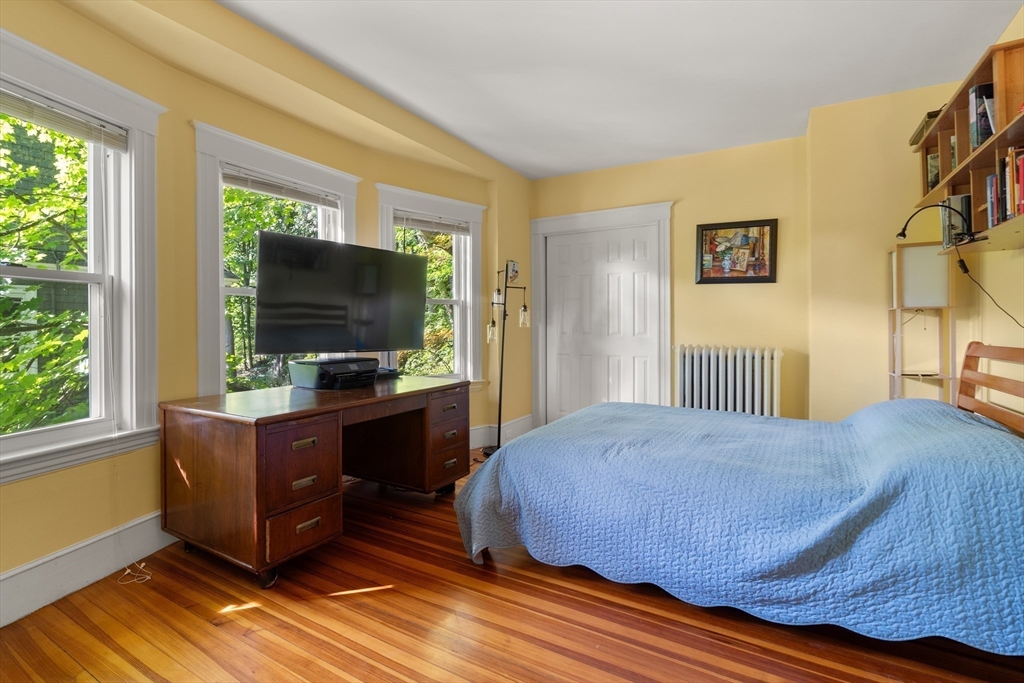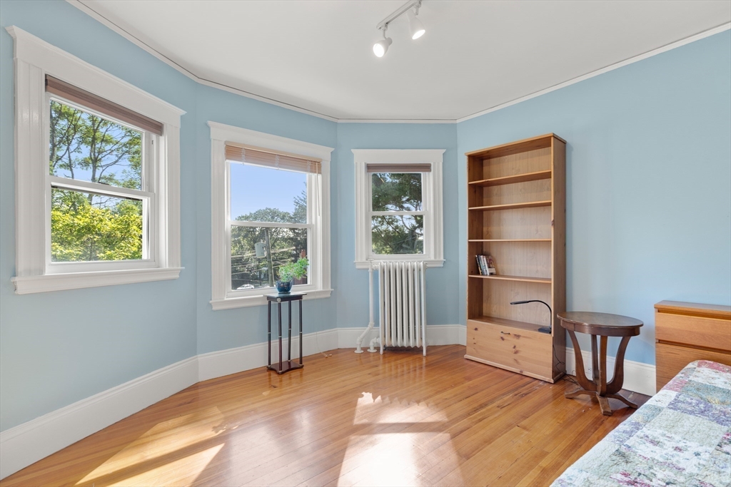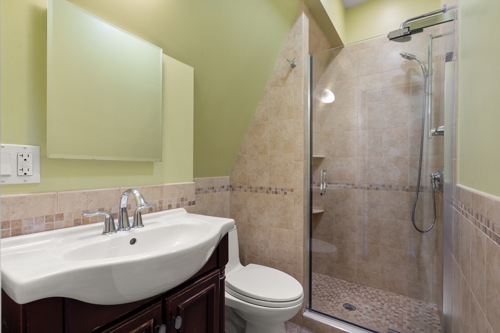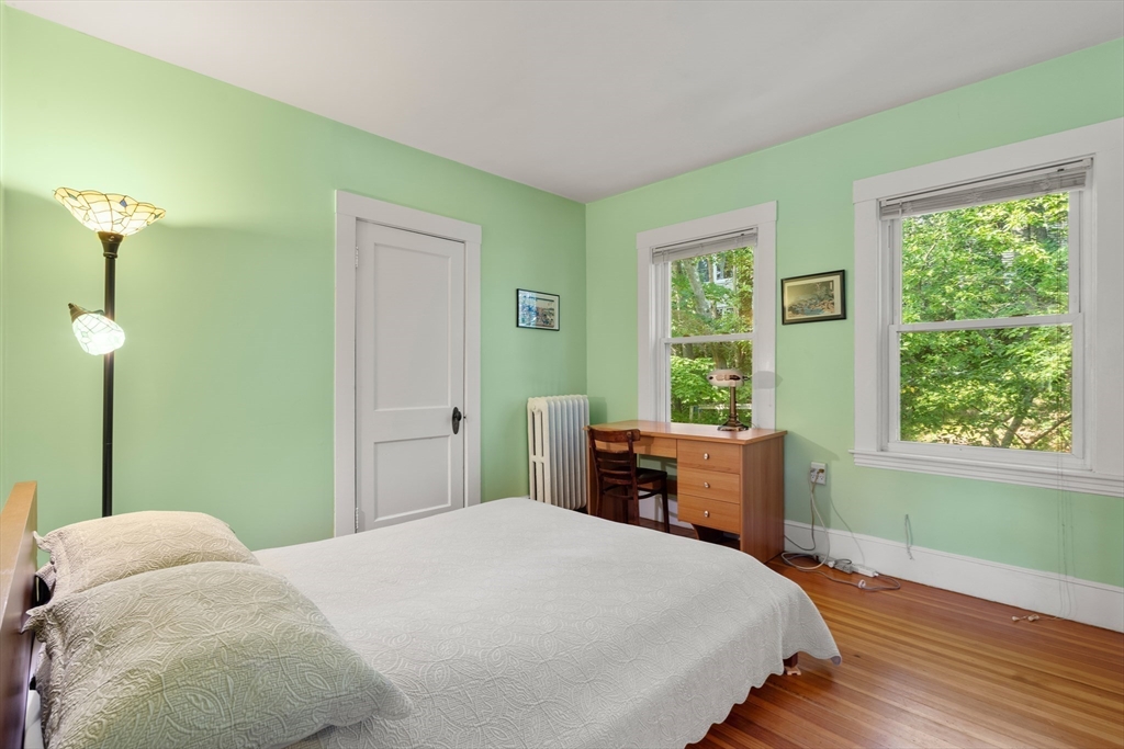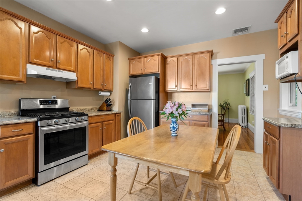 Beautifully Maintained 4 Bed / 3.5 Bath in Newton Centre. This 1950 Dutch Gambrel blends timeless charm with modern updates. A sunny front porch welcomes you into a gracious foyer featuring an original wood-burning fireplace and stained-glass windows. The living room with hardwood floors and recessed lighting flows into a spacious dining room - perfect for entertaining. The renovated kitchen offers stainless steel appliances and gas cooking, with an adjacent powder room, pantry, and laundry area. Upstairs, the large primary suite boasts two walk-in closets. A bright second bedroom has a renovated bath across the hall and the quiet 3rd bedroom has a renovated en-suite bath. The lower level includes a fourth bedroom, full bath, and ample storage. Enjoy a shaded backyard and two-car driveway. Prime location near Newton Centre, Crystal Lake, Weeks Field, Newton South High School, and dining/shopping on Rt. 9.