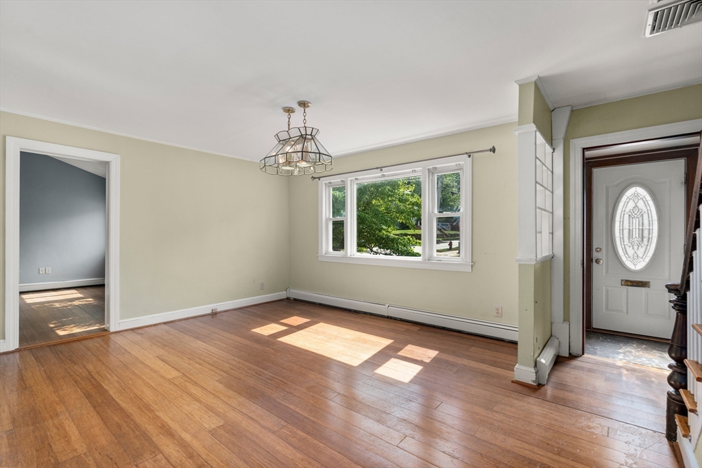 Great Robin Hood Neighborhood located on a corner lot with ample off-street parking. Step into a spacious dining room that seamlessly connects to a kitchen with an island and breakfast bar. The expansive first-floor main bedroom offers generous closet space, abundant natural light, and an en-suite bath with a stand-up shower. Before heading upstairs, relax in the family/living room that overlooks a large, fenced yard. The second floor includes two more generously sized bedrooms, a full bath, and plenty of storage and closet space. The basement features an in-law/au pair apartment with a comfortable bedroom, living room, kitchen (no stove), and full bath--ideal for extended family or a teen! While the house needs some TLC, it comes with a newer heating system and is conveniently located near public transportation, highways, and various shopping options.