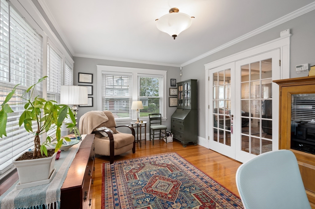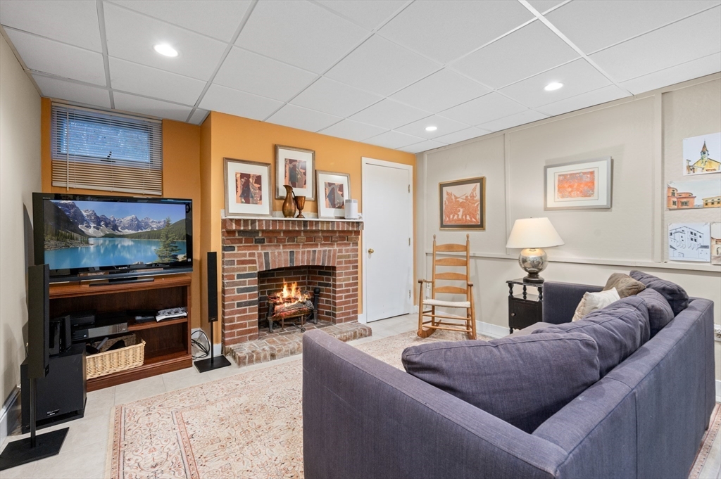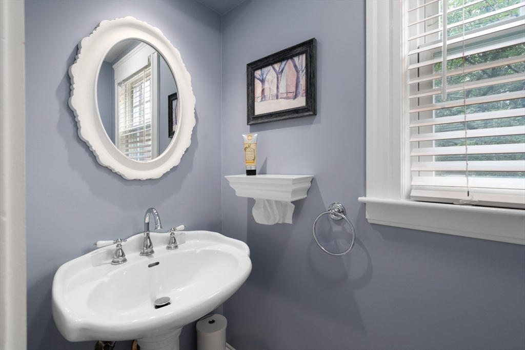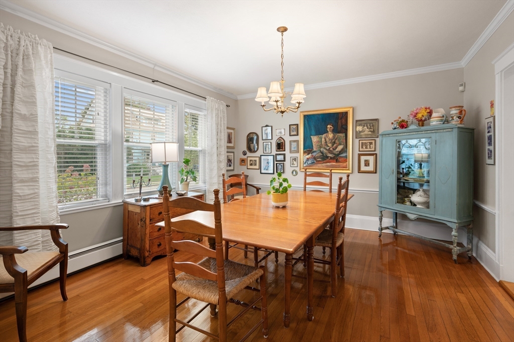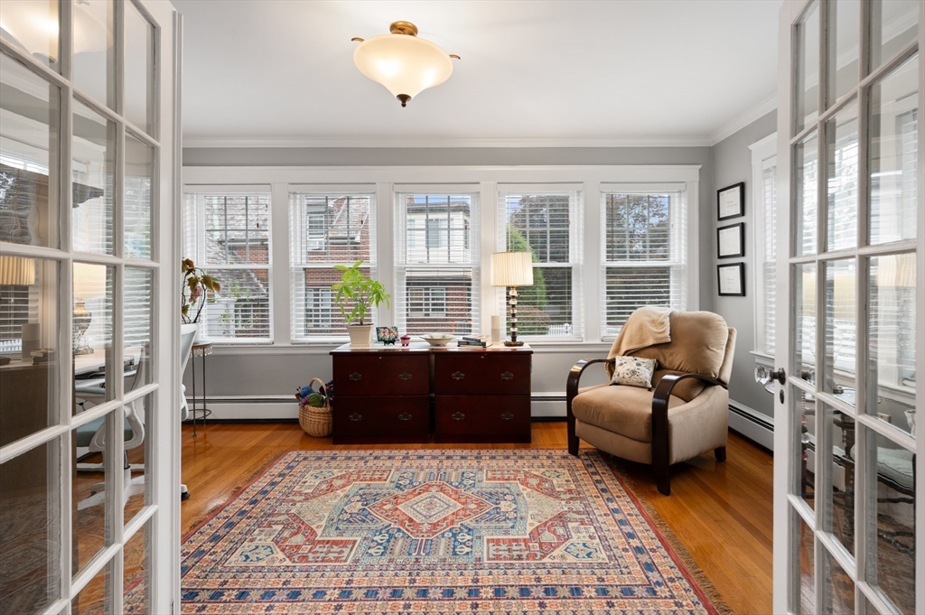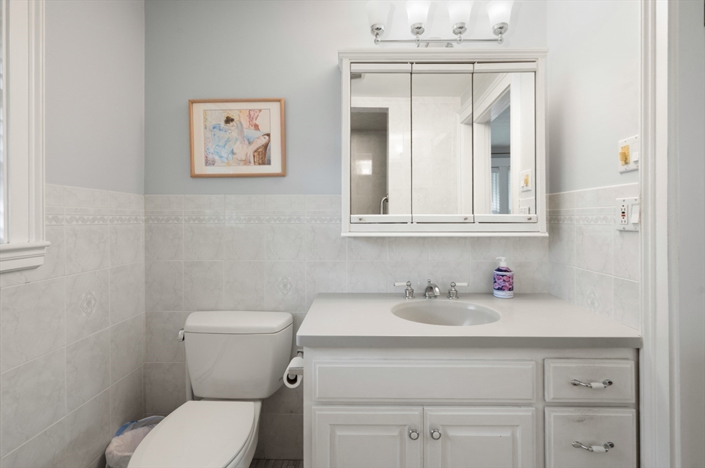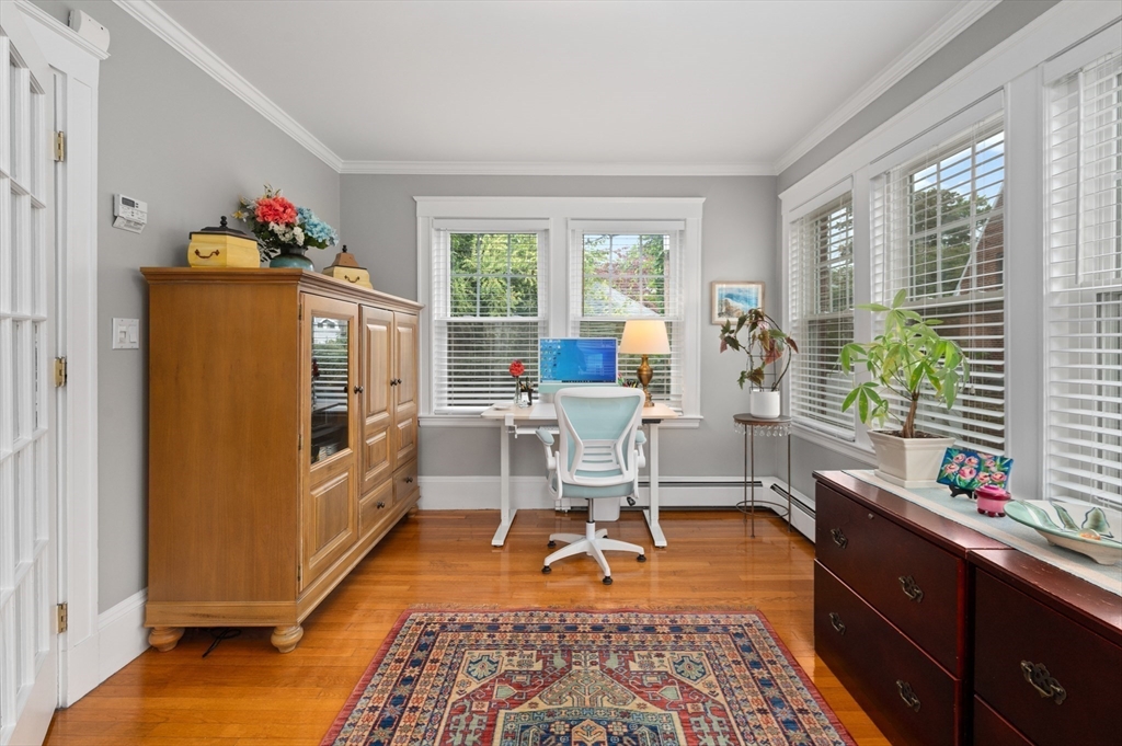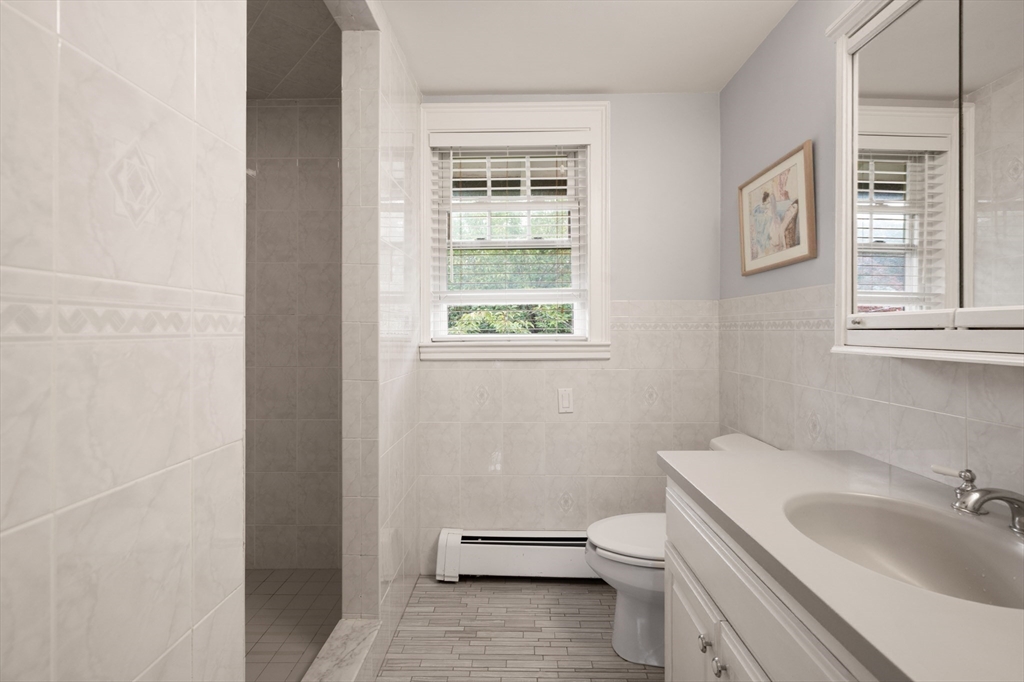 The Heart of Lawrence Estates. Pristine center entrance 12 room 4+ bedrooms solid brick colonial. 100 year slate roof. Seldom seen today. Interior designer owned. Enter sparkling foyer, turn right into formal living room w beam ceiling and fireplace. Flow to glass year round sunroom/home office. Left of foyer enter formal dining room, detail mouldings, high baseboards and chair rail. Kitchen is state of the art, high end appliances, gas stove, granite countertops, soft mushroom cabinetry and ceramic flooring. Adjacent 1/2 bath. Special feature is a separate breakfast room, walk out to a 1 car garage and fenced rear yard designed by the designer of Rose F. Kennedy Greenway. 2nd floor w 3 full bedrooms, en-suite primary bedroom, full bath, steam generator. Two ample bedrooms and an additional full bathroom. Hardwood floors throughout and central a/c. Bonus 1,074 sqft walkout bulkhead lower level ideal for au-pair, craft room, gym, secondary office and bedroom. Steps to Medford Square.