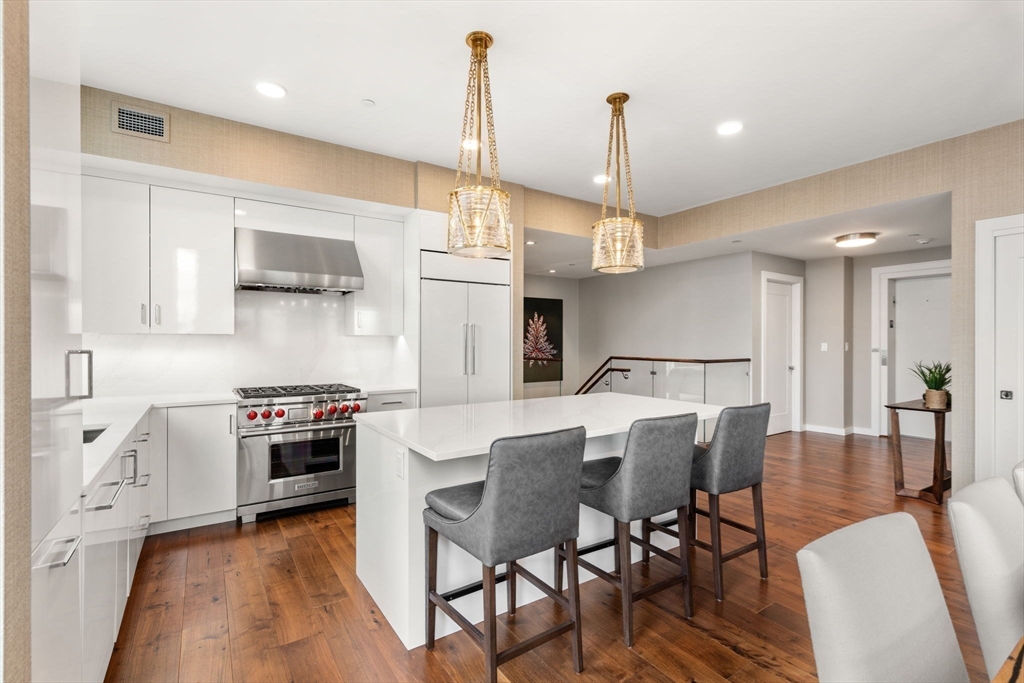 Newer Construction Designer Penthouse w/ Ocean views. Turnkey City Point penthouse decorated by one of Boston's leading interior designers and being sold fully furnished (or empty). Direct elevator access opens to a sprawling kitchen, dining & living area w/ stunning water views. Living area features stone fireplace, custom walnut cabinets, dry bar & plenty of sunlight. Private deck looks directly at Ocean and is perfect for entertaining. Dining area w/ custom chandelier & dining table. Ktichen w/ European cabinets, Wolf & Sub Zero appliances & Calcutta gold quartz countertops. Huge primary bedroom has custom walk-in closet, en-suite marble bath with double vanity & radiant floors. Spacious 2nd & 3rd bedroom each have custom closets. Custom window treatments, motorized shades, laundry & central AC. 2 garage parking (side by side). East Side location with easy walk to beaches, yacht clubs, restaurants & more. This penthouse has been beautifully designed & decorated and is move-in ready.